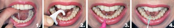 1. Hammaslankaa käyttäessäsi vie lanka sormin edestakaisilla liikkeillä varovasti ienreunaan. Liikuta lankaa ylös ja alas painaen ensin toisen hampaan kylkeä vasten ja sitten toisen.